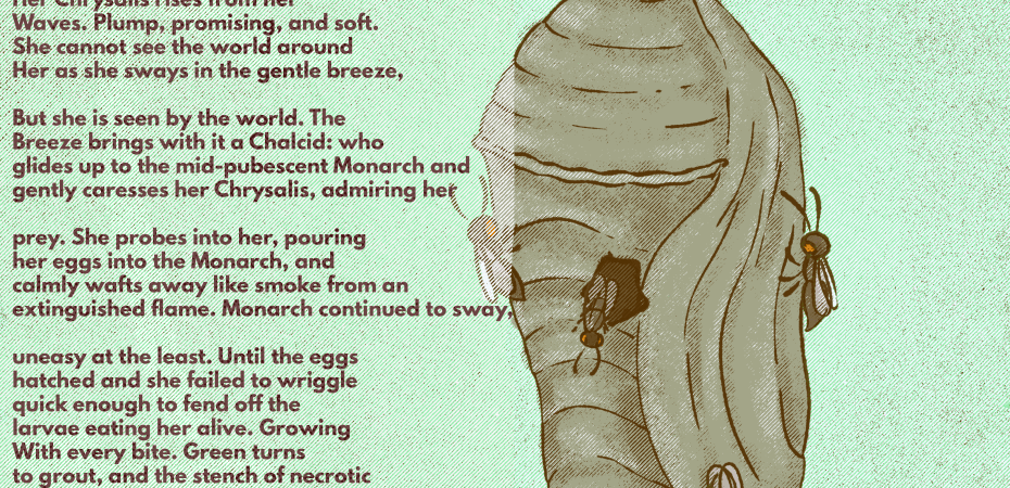 I thought a good way to illustrate this feeling would be the relationship between a monarch and a parasitic wasp. Certain species of chalcid wasps will stalk monarch caterpillars and wait for them to form their chrysalis. Once the caterpillar has formed its chrysalis, chalcids will swoop in and lay eggs in the chrysalis while it is still soft. There is nothing that the caterpillar can do to defend itself in this state. The chalcid larvae will eventually hatch and eat the monarch alive. Instead of a monarch emerging, chalcids will pour out of small holes in the chrysalis and leave the empty chrysalis as a reminder of something that could have been but was not.