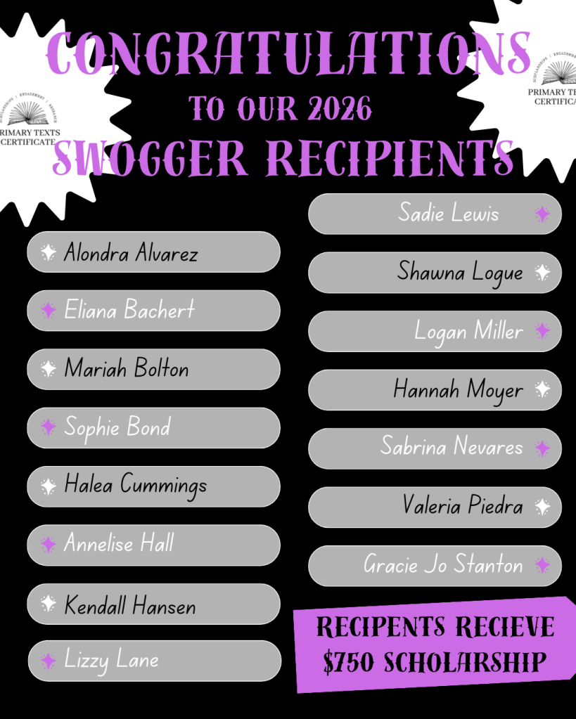 2 Apr 2026 ptliveideas Primary Texts Certificate: Swogger Scholarship Spring 2026 Recipients Congratulations to the Spring 2026 Swogger Scholarship recipients!This $750 award recognizes students enrolled in the Primary Texts Certificate program. Share this: Share on X (Opens in new window) X Share on Facebook (Opens in new window) Facebook Like Loading... Related