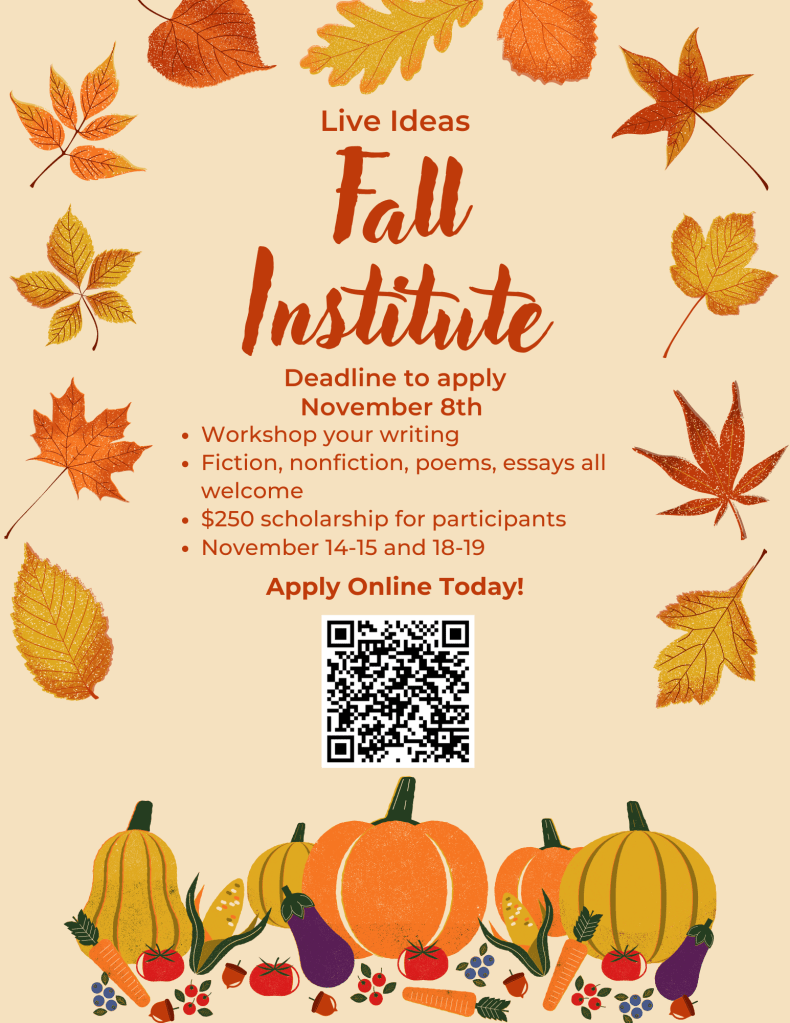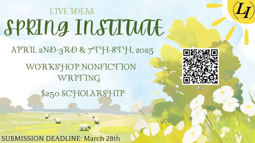 This Spring the Live Ideas Journal will be holding a Writing Institute for Non-Fiction pieces exclusively. The dates for the institute are the 2nd, 3rd, 7th, and 8th of April. There is a $250 scholarship for those who attend all four days of the workshop. To submit follow the QR code or this link: https://form.jotform.com/250317058058152