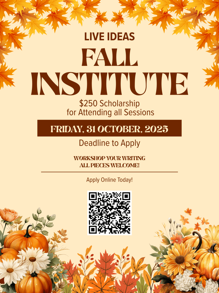 Have you been doing any writing this semester? The Live Ideas Fall Institute is the perfect time to showcase and workshop it! The institute will be held from November 14th- 15th and 18th- 19th at 6:00-7:30pm . All pieces are welcome- fiction, nonfiction, poems, essays, etc. The purpose of these institutes is to help undergraduate students perfect their pieces alongside their scholarly and artistic peers. A $250 scholarship will be awarded for those who attend all sessions of the institute. The institute will begin on Thursday, November 14th, and continue onto Friday, the 15th. From there, we will break for the weekend to give students ample time to work on revising their pieces. We will then meet back up on Monday, November 18th, and conclude the institute on Tuesday, the 19th. The institute will be held in person, on campus. If your application is accepted you will receive a confirmation email with additional details.